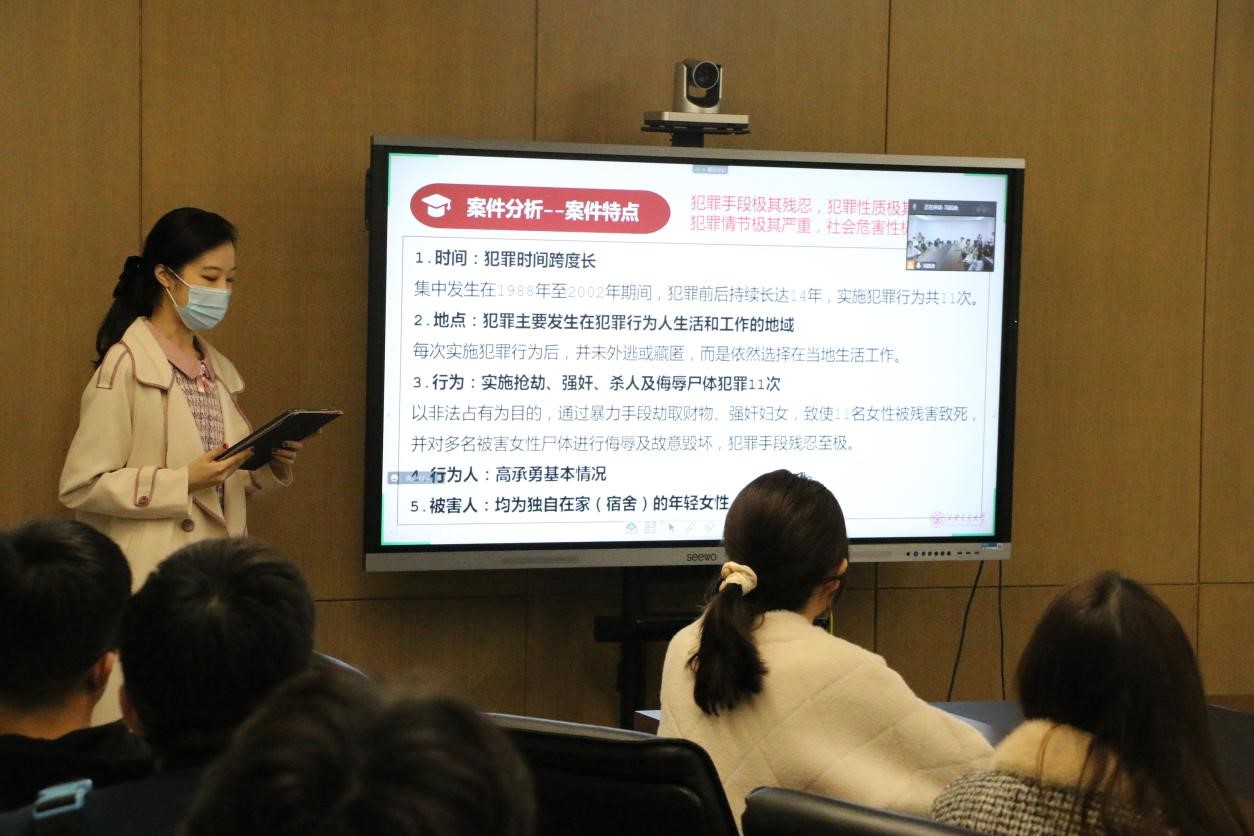 本期普法微课堂聚焦旷世大案“甘肃白银连环杀人案”。球友会马卓同学首先介绍了案件基本案情。从1988年至2002年间,高承勇在我国甘肃省白银市及内蒙古包头市连续杀害女性11名,作案跨度14年,最小受害人年仅8岁,手段残忍,极具隐蔽性,造成了巨大的社会恐慌。随后,马卓同学就罪犯的家庭背景、生活环境和作案习惯等方面进行了讲解,深入浅出地使同学们在短时间内对该案件形成了系统性认识。